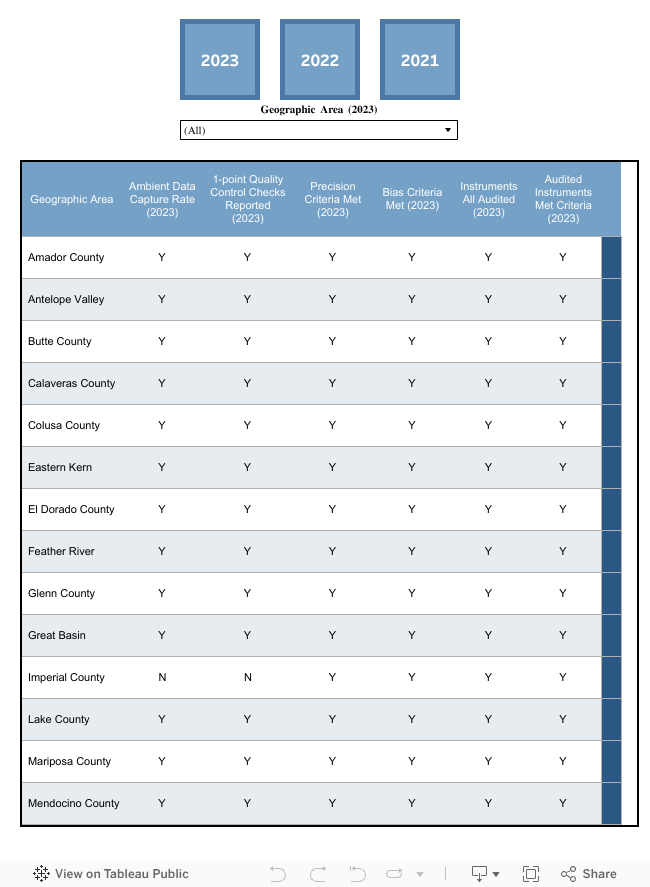 Explore the data quality results by geographic area and/or by year (2023 and the previous two years) using the interactive tables below. A geographic area refers to a region covered by a monitoring organization. Sites may be operated by the monitoring organization, CARB, or both. Table 1 presents data quality results from gaseous instruments, while Table 2 presents data quality results from PM samplers.